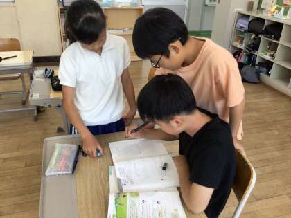 個々で考えてから、友達同士で教え合っていました。