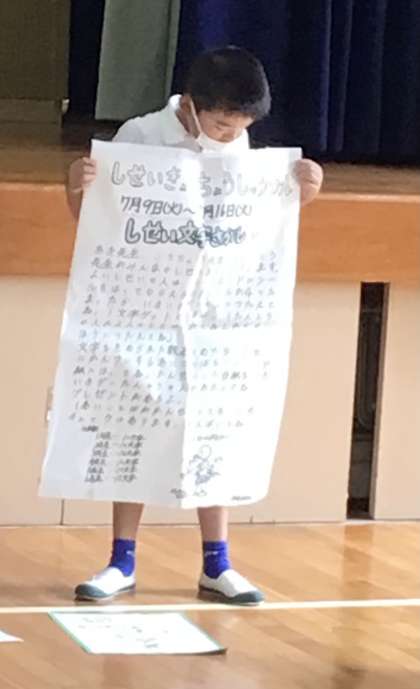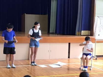 保健委員会からは、今月のめあて「夏を健康に過ごそう」の連絡と姿勢強調習慣の説明がありました。どういう姿勢が良いのかを実演して説明してくれたのでよくわかりました。