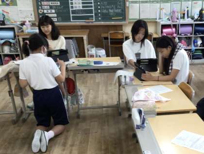 観光地を一人一ヶ所調べて、タブレットで説明やクイズを出します。