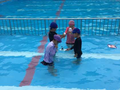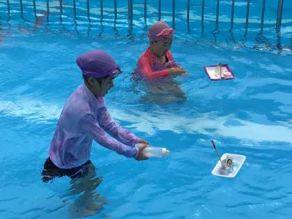 水泳の授業の続きで、発泡スチロール等で作った船を浮かして動かしてみました。