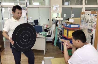 図画工作科で作った発泡スチロールの的とダンボールで作った鉄砲で、的当てをしています。