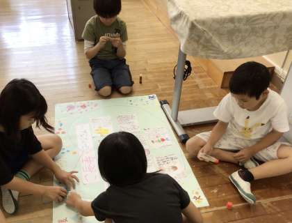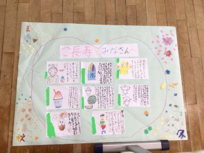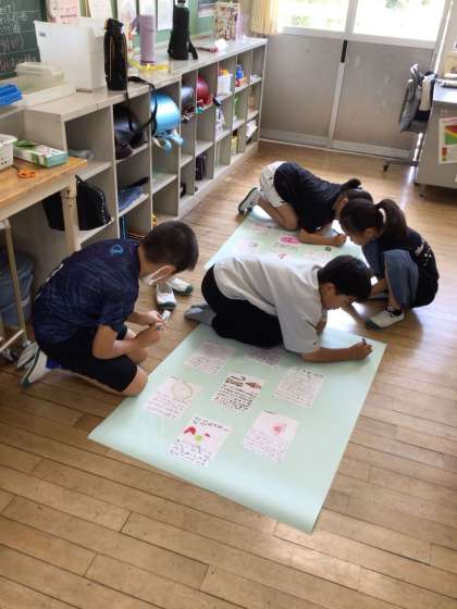 夏休みのお話を聞いた後、高齢者の方への手紙をB紙に貼っていました。