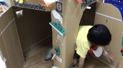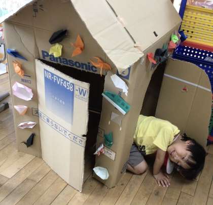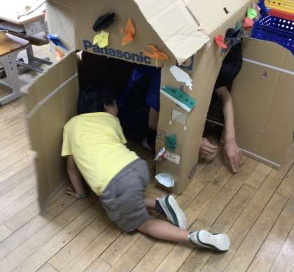 休み時間、お兄ちゃんが作ってくれたダンボールハウスで遊んでいます。