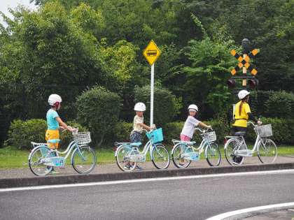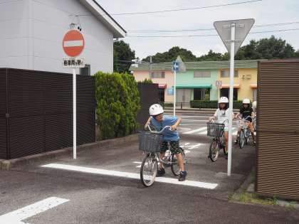 道路を走って一時停止での左右確認をしたり、歩道を走って踏み切りを渡ったりしました。