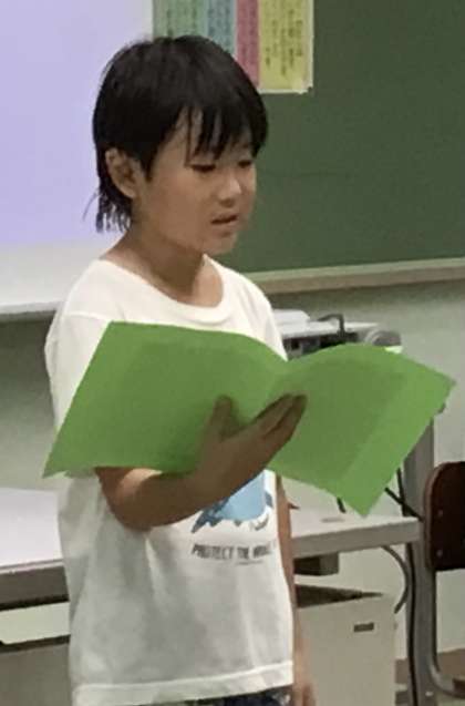 9月2日 夏休み後集会 スピーチ1 公開日 2024/09/02 更新日 2024/09/02 お知らせ 5人の子たちがスピーチをしました。 全児童がコンピュータ室に集合して行いました。 最初は、2年生の子です。最初は緊張していた水泳学習でしたが、蹴伸びやバタ足が去年よりできるようになって水泳が好きになってきたこと、来年度はバタ足で20mと深いプールでクロールができるようになりたいことを話してくれました。具体的な目標を立てていて立派でした。