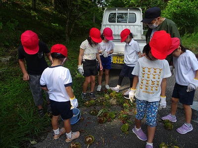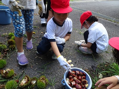 校内整備員さんのおかげで、栗拾い体験をすることができました。 立派な栗です。