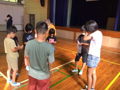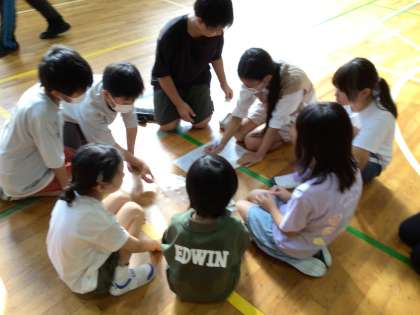 運営委員会から、次の縦割班交流は同じ班の子の良いところを見付けてかがやきカードを書いて交換しますという連絡がありました。そのため、縦割班に分かれて誰が誰にメッセージを書くかを決めました。