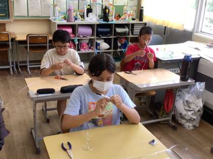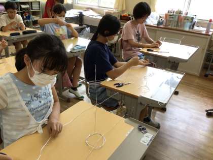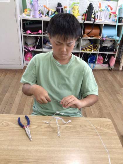 何を作っているのか聞くと、「天秤のようなもの」と答えてくれる子もいますが、ほとんどの子は頭を傾けながら作っていて答えてくれません。
