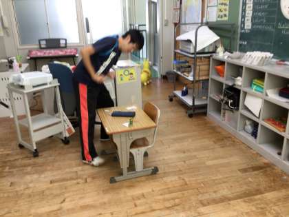 飛び跳ねるのが怖くて、教室の隅に逃げています。