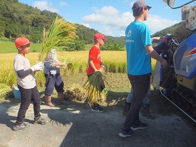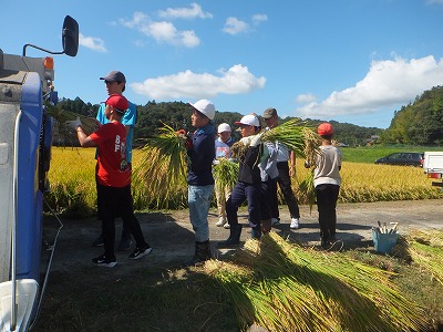 脱穀を機械の力を借りて行いました。 藁の束がたくさん残りました。