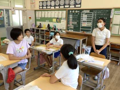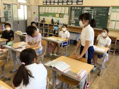 振り返りを発表しています。 発表している子を見て、しっかり聴いています。