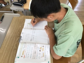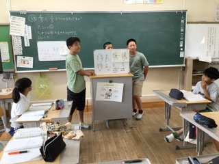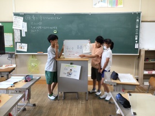 分数の学習を進めている5年生。今日は異分母分数の大きさを比べました。分母が違う分数をどうやったら比べられるのか、チームでアイデアを出し合いました。