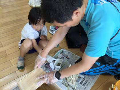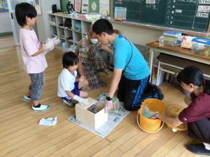 子どもたちには、大分慣れてきて、モルモットのハナちゃんが自ら子どもたちの手の臭いをかぎに来ていました。