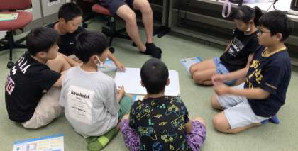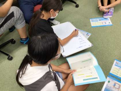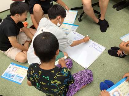 保健委員会の子たちが司会進行をしています。記録係がホワイトボードに話し合いで出た意見をまとめています。