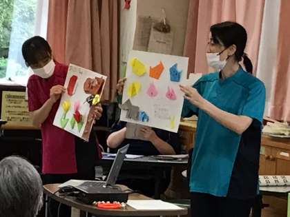 画用紙に動物などの折り紙を貼ったものはふじのさとの職員さんに渡しました。かわいい顔の動物の折り紙は高齢者の方一人一人に手渡ししました。
