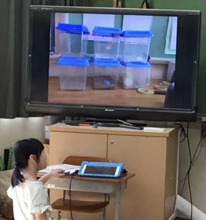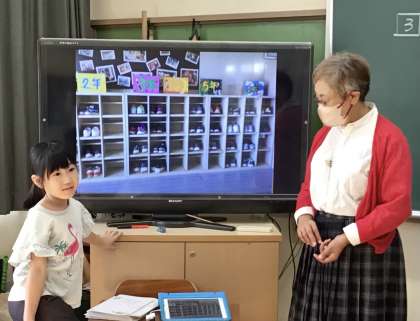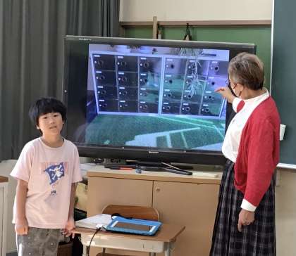 校内で見付けてきたかけ算を大型テレビに映して、紹介しているところです。