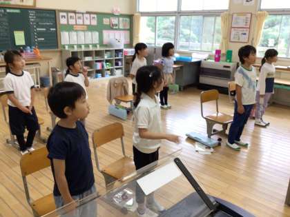 「しろくまのジェンカ」のおもしろいところを見付けました。歌詞のかわいいところやリズムの良さなどに気付いたようです。