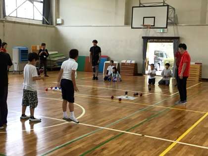 走った後、体育館に戻って、ボッチャを行いました。