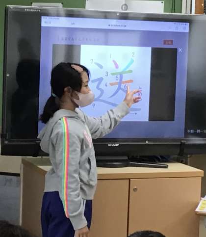 4年生の子たちが順番に前に出てきて、漢字の成り立ちや止め・はね、筆順を説明しています。