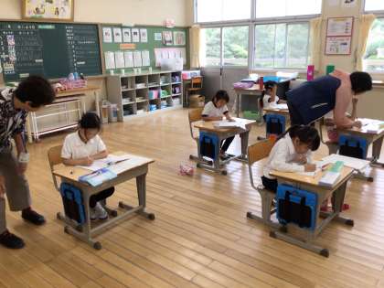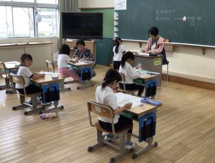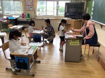 「さんすうのとも」で、9➕4のような計算の練習をしています。終わった子からドリルコンテストの勉強に進みます。数図ブロックや手を使ったり、頭の中で計算したりしています。数図ブロックや手を使って計算する段階も大切です。頭の中に浮かんでくるようになるからです。この時間でも少しずつ段階を変えていっている子がいました。
