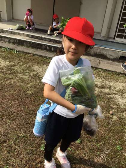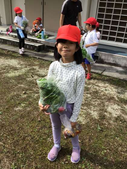 畑で育てている野菜を収穫しました。お店で売られているラディッシュや小松菜より大きいです。おいしそうです。お家で食べてください。