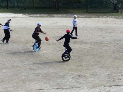 一輪車に乗っている2人でボールをキャッチし合いながら一輪車をこぐ子もいます。