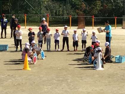 フラフープを一輪車をこぎながら熱盛隊の子にかける子たちがいます。