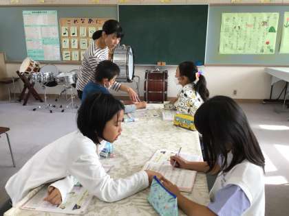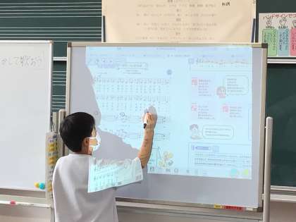 「ゆかいに歩けば」という曲を聴き、「跳んでいるみたい」「だんだん大きくなっている」などの感想を呟いていました。そこで、その曲想が楽譜に表れているところを探しました。4年生の子が3年生の子に「こういうところだよ」とサポートしています。スクリーンに写っているデジタル教科書に見付けたことを書き込みながら発表しました。