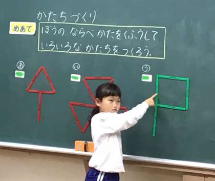 大型テレビに映っているデジタル教科書の図形を数え棒を並べて机の上に作っています。