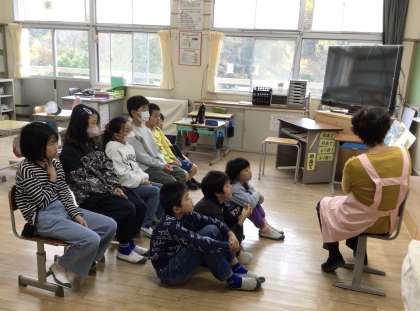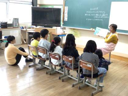地域共働本部の地域コーディネーターさんが読み聞かせボランティアとして、「あしなが」という本を読んでくださいました。