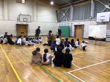 自称ユーチューバーさんの振りで、コンサートホールの方がスクリーンで説明をしてくださいました。子どもたちは興味津々で、自然と前の方に移動していました。