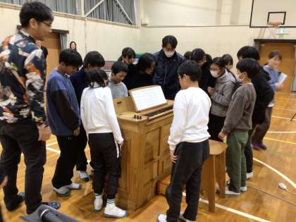 事業が終了して、おとなしく自席で聞いていた高学年がパイプオルガンの周りに来て見ていました。