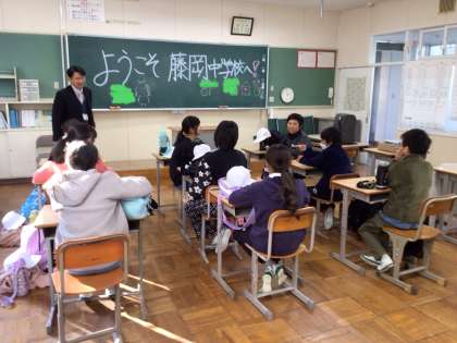 藤岡中学校に着くと下駄箱に御作小学校の児童の名前が貼ってありました。もうすぐ中学生なんだと実感したようです。昇降口から数学教室に案内された直後の写真です。まるで自分たちの教室のような雰囲気です。