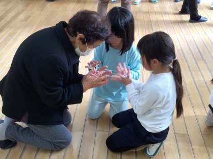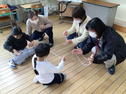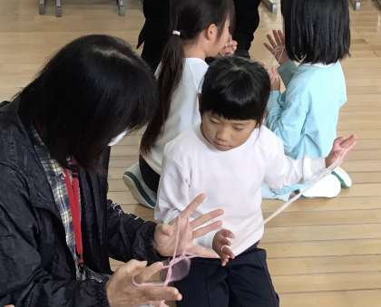 ボランティアの方と一緒に、あやとりとけん玉をしました。