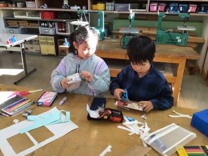 箱の外側に絵を描いたり、作ったトマトやリボンなどを貼ったりして、オリジナルな箱を作っています。中に入れる宝物を作っている子もいました。