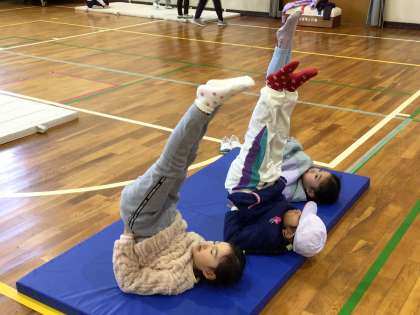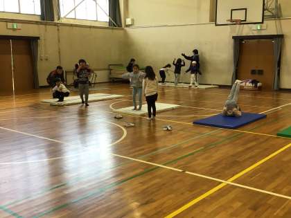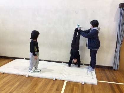 マットの上で、前転、後転、逆立ち、ゆりかごなど、自分で選んで練習をしていました。