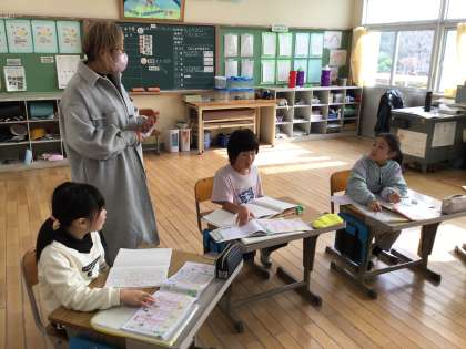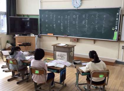 黒板に書いてある以外では、「毎日、海へ行く」「弓を引く」「答えが合っている」のような文ができました。