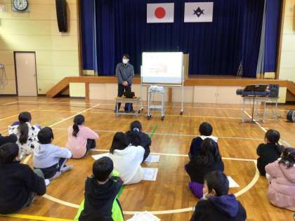 本校の教諭が大正琴を習っているということで、子どもたちに大正琴の音色を聴いてもらいました。キーと弦で演奏する楽器で、和洋折衷の楽器でもあります。楽曲は「勇気100%」とクリスマスソングです。素敵な音色に幸せ感満載になりました。