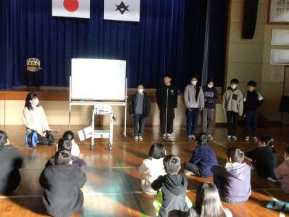 1月7日 冬休み後集会 連絡 公開日 2025/01/07 更新日 2025/01/07 お知らせ 書き初め大会についての連絡がありました。連絡されたことを気を付けて書いていました。 運営委員会からお年玉募金の連絡がありました。お年玉から少しでいいので募金できるといいですね。 図書委員会から読書祭りの連絡がありました。「キーワードを探せ」や「紅白勝負」など、図書委員の子たちが考えてくれた企画があるようです。楽しみですね。たくさん本を読みましょう。