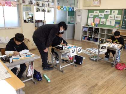 高学年になっていくにつれ、お手本の字も難しくなっていきます。「四季の風」です。5年生の子たちは、お手本をよく見て書いていて、どの子もお手本の字の大きさと同じで、堂々とした字が書けています。何枚か書いて、どの字がいいかという判断も的確になってきます。