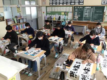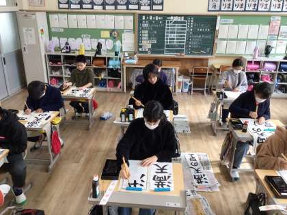 6年生は、小学校最後の書き初め大会です。お手本を見る目も真剣です。名前も丁寧に書いています。「満天の星」、どの字も難しいです。6年生になると筆使いも上手です。姿勢も良いです。