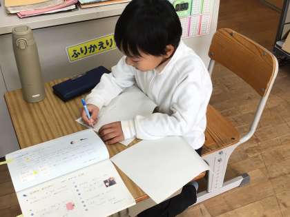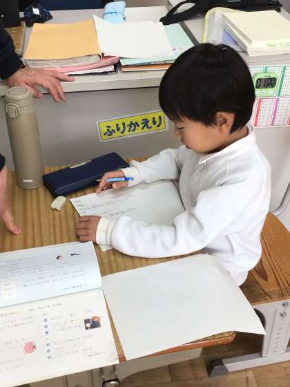 「田中先生は愛ち県にすんでいる」「田中先生は穴におちる」「田中先生は辛い物を食べる」というように、「ーに」「ーを」という言葉も入っています。上の文章どおり、漢字も使って書いていました。