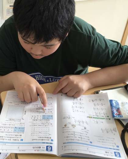 分数の計算と変わり方の問題を真剣に解いています。