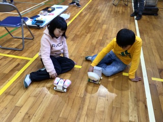 先週に引き続き、豊田市のものづくりサポートセンターから7名の講師の方をお招きして、風で動く車を作りました。今回は自分で持参した材料を使って工夫して作りました。作っては走らせを何度も繰り返し、試行錯誤する真剣な姿が印象的でした。