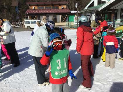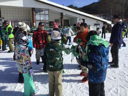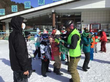 インストラクターさんや先生からゼッケンをもらっています。御作小学校は緑のゼッケンです。ゴーグルをしてしまうと、スキー場を滑っていると、誰なのかわかりません。お子さんのゼッケンの番号を頼りに写真をご覧ください。
