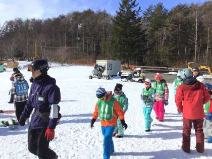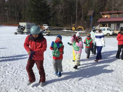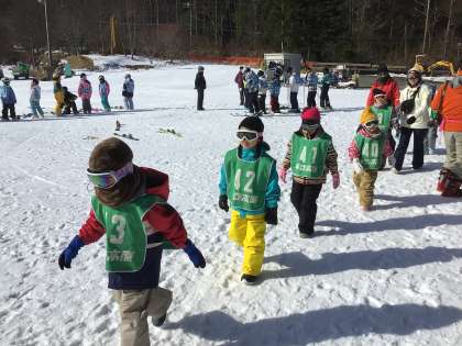 並んで、コースごとに、スキー板をもらいに行っています。