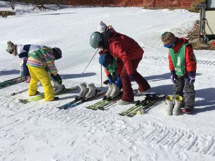 スキー靴を履いたらスキー板です。靴の雪を取って、靴先を差し込んで踏み込むとカッチャと音がして装着完了。コースによっては板に靴を装着させてから一緒に装着というコースもあります。