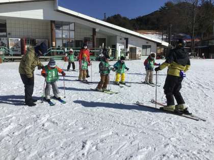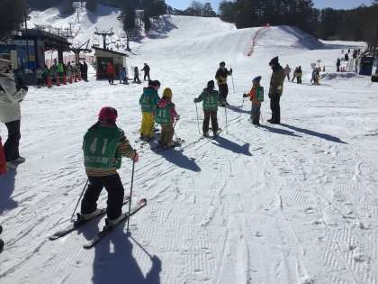 すぐにリフトにはのらず、ロッジの前で慣らしてから、リフトにのっていくコースの子たちもいます。