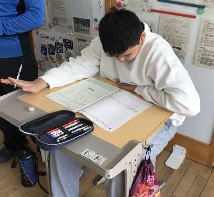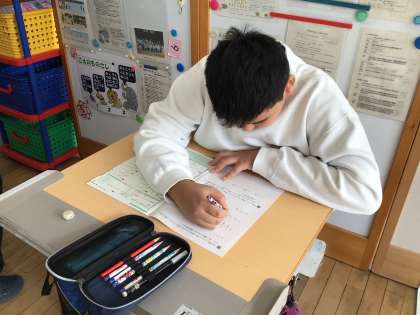 最初が分数の計算です。しばらく見つめた後、計算し始めました。