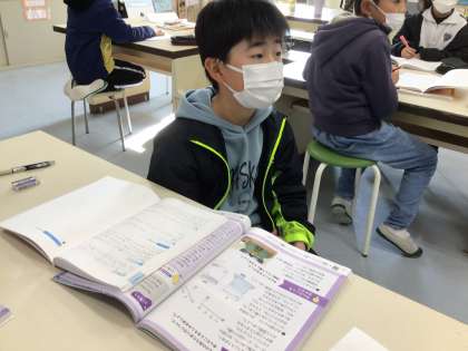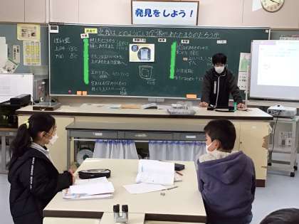 「空気はどのようにして全体があたたまるのだろうか」というめあてに対して、予想して実験して結果から考察していました。ノートのたしかめ問題では、黒板に書いてある子どもたちの意見を確認しながらまとめていました。